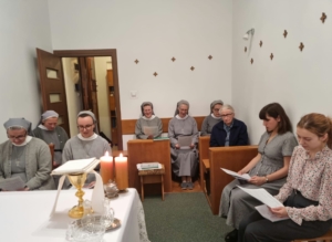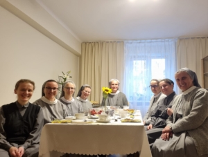 Z tej okazji Siostry Urszulanki ze Starowiślnej otoczyły nas modlitwą i duchową łącznością, ofiarując w intencji naszego Zgromadzenia Mszę Świętą w swojej kaplicy – miejscu, w którym odczuwa się szczególną obecność Matki Założycielki. Wieczorem kilka sióstr odwiedziło naszą wspólnotę. Razem przeżyłyśmy Eucharystię, a po niej spotkałyśmy się przy stole, dzieląc się serdecznymi rozmowami i pogłębiając więzi wspólnoty.